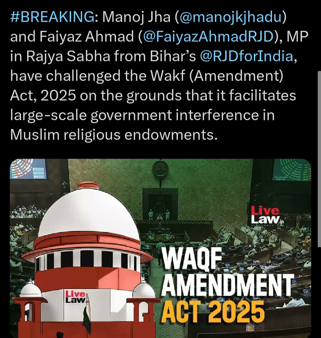 वक्फ संशोधन विधेयक के खिलाफ राष्ट्रीय जनता दल की ओर से राज्यसभा सांसद प्रो0 मनोज कुमार झा, मो0 फैयाज अहमद और विधायक मो0 नेहालुद्दीन की ओर से न्याय के लिए तीन याचिका सर्वोच्च न्यायालय में अधिवक्ता के माध्यम से दी गई है, जिसे स्वीकृत कर लिया गया है।