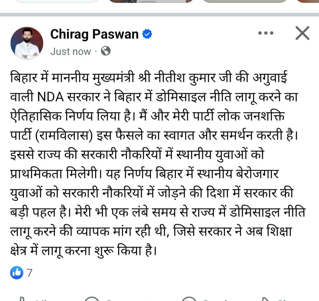 केंद्रीय खाद्य प्रसंस्करण उद्योग मंत्री सह लोक जनशक्ति पार्टी (रामविलास) के राष्ट्रीय अध्यक्ष चिराग पासवान ने अपने एक्स पर पोस्ट कर लिखा कि बिहार में मुख्यमंत्री श्री नीतीश कुमार जी की अगुवाई वाली एनडीए सरकार ने बिहार में डोमिसाइल नीति लागू करने का ऐतिहासिक निर्णय लिया है। मैं और मेरी पार्टी लोक जनशक्ति पार्टी (रामविलास) इस फैसले का स्वागत और समर्थन करती है। इससे राज्य की सरकारी नौकरियों में स्थानीय युवाओं को प्राथमिकता मिलेगी। यह निर्णय बिहार में स्थानीय बेरोजगार युवाओं को सरकारी नौकरियों में जोड़ने की दिशा में सरकार की बड़ी पहल है।