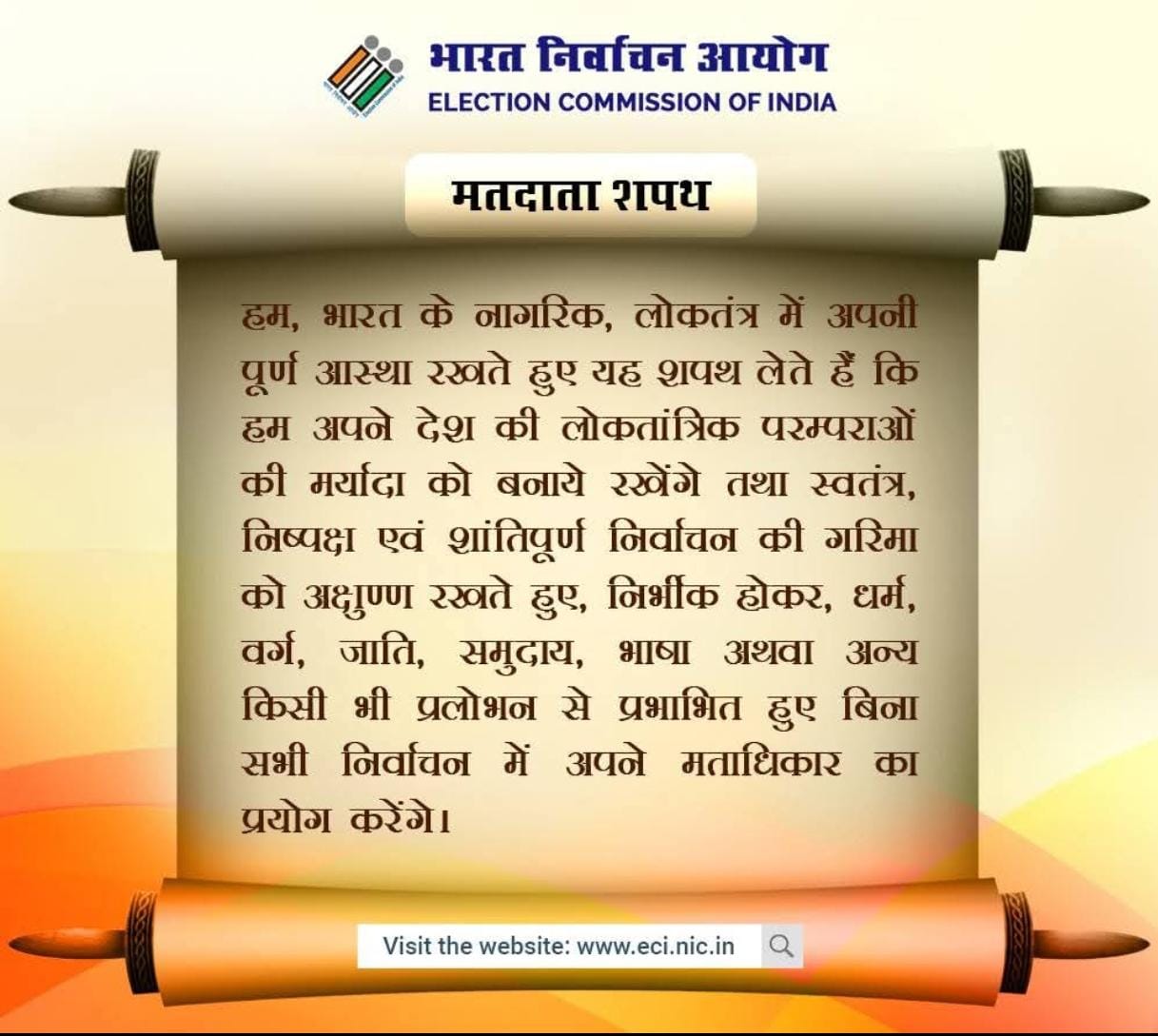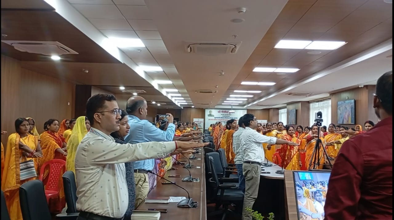 उप विकास आयुक्त ने इस अवसर पर उपस्थित सभी व्यक्तियों को लोकतंत्र में अपनी आस्था रखने तथा स्वतंत्र, निष्पक्ष एवं शांतिपूर्ण निर्वाचन की गरिमा को अक्षुण्ण रखते हुए निर्भीक होकर, धर्म, वर्ग, जाति, समुदाय, भाषा अथवा अन्य किसी प्रलोभन से प्रभावित हुए बिना मताधिकार का प्रयोग करने की शपथ दिलाई गयी। उपस्थित कर्मियों, अधिकारियों एवं जीविका दीदियों ने शपथ लिया कि – ‘‘हम, भारत के नागरिक, लोकतंत्र में अपनी पूर्ण आस्था रखते हुए यह शपथ लेते हैं कि हम अपने देश की लोकतांत्रिक परम्पराओं की मर्यादा को बनाये रखेंगे तथा स्वतंत्र, निष्पक्ष एवं शांतिपूर्ण निर्वाचन की गरिमा को अक्षुण्ण रखते हुए, निर्भीक होकर, धर्म, वर्ग, जाति, समुदाय, भाषा अथवा अन्य किसी भी प्रलोभन से प्रभावित हुए बिना सभी निर्वाचनों में अपने मताधिकार का प्रयोग करेंगें।’’ सभी ने एक स्वर में कहा कि हम लोकतंत्र का महात्योहार मनायेंगे। वोट देने जरूर जायेंगे। लोकतंत्र में वोट ही हमारी ताकत है, वोट ही हमारी हिम्मत है।