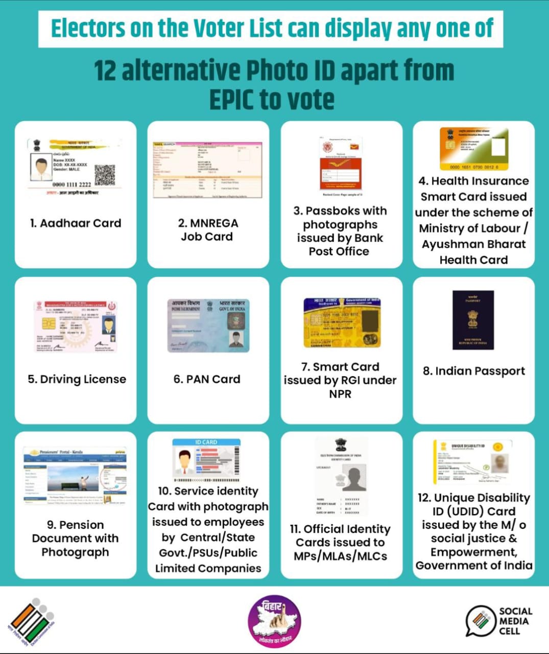 यदि किसी मतदाता का नाम मतदाता सूची में है, तो मतदान के लिये फोटोयुक्त वोटर आईडी कार्ड के अलावा 12 वैकल्पिक फोटोयुक्त दस्तावेजों में से कोई भी एक दस्तावेज दिखाकर मतदाता मतदान कर सकते हैं। हर अधिकारी इसका अनुपालन सुनिश्चित करेंगे। किसी भी वोटर को मतदान से वंचित नहीं करेंगे।