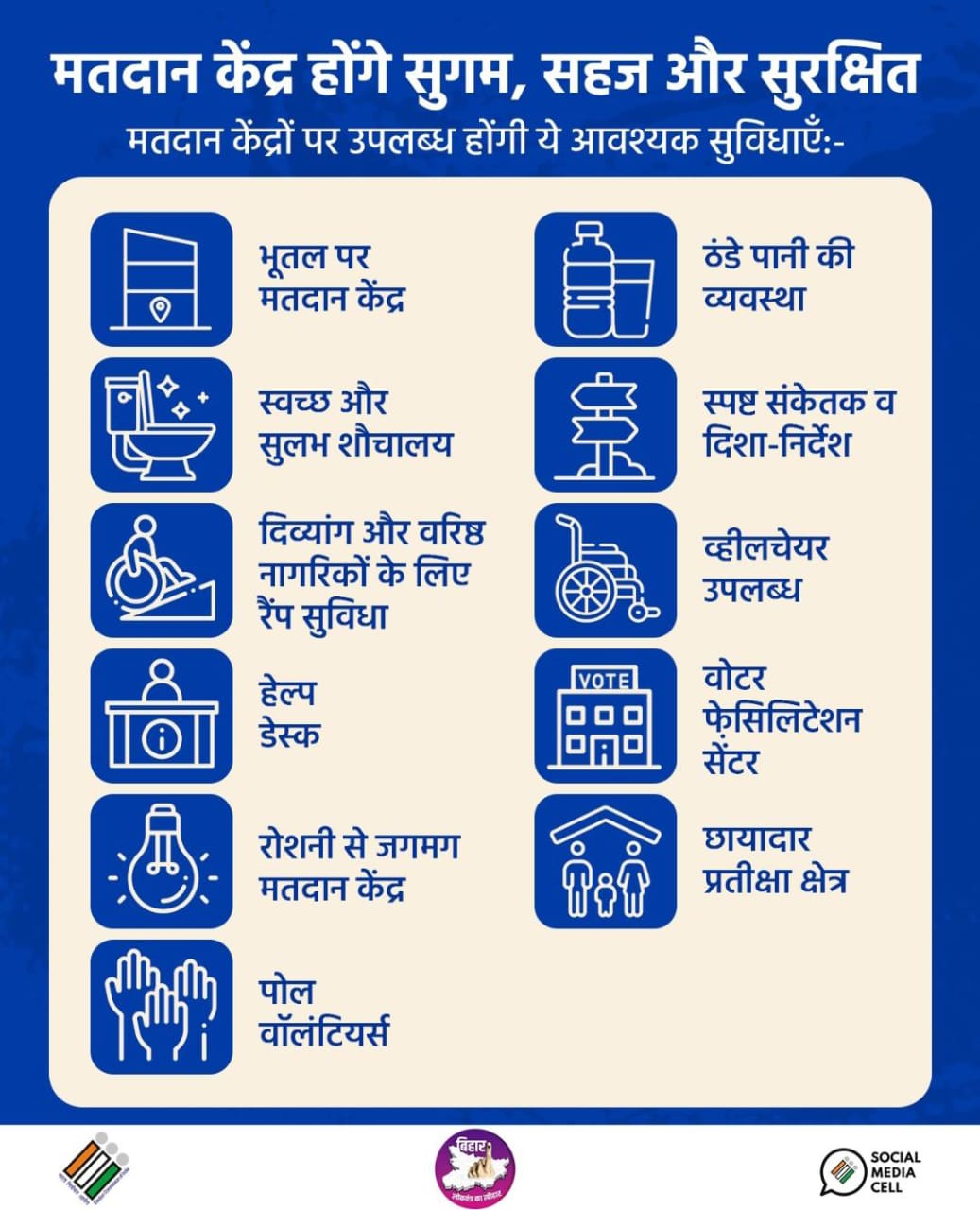 4. मतदान केन्द्र सुगम, सहज और सुरक्षित होना चाहिए। हर एक मतदान केन्द्र पर सुनिश्चित न्यूनतम सुविधाएँ (एएमएफ) उपलब्ध रहनी चाहिए। सुलभ एवं स्वच्छ शौचालय, शुद्ध पेयजल, हेल्प डेस्क, भूतल पर मतदान केन्द्र, दिव्यांग और वरिष्ठ मतदाताओं के लिए रैम्प, पोल वोलंटियर्स, पर्याप्त रौशनी, विद्युत, स्पष्ट संकेतक एवं दिशा-निर्देश, व्हीलचेयर, वोटर फैसिटिलेशन सेंटर, छायादार प्रतीक्षा केन्द्र इत्यादि की उत्कृष्ट सुविधा रहनी चाहिए।