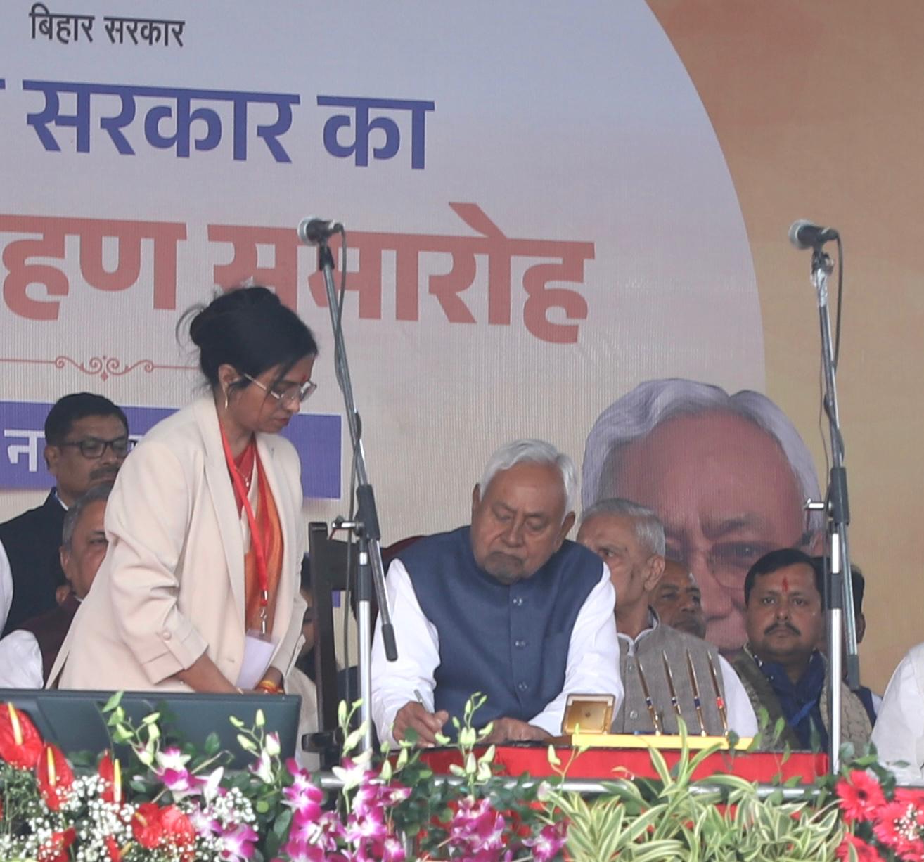 बिहार की नवनिर्वाचित सरकार के शपथ ग्रहण समारोह में श्री नीतीश कुमार ने आज पटना के ऐतिहासिक गॉधी मैदान में मुख्यमंत्री पद की शपथ ली। राज्यपाल श्री आरिफ मोहम्मद खान ने श्री नीतीश कुमार को मुख्यमंत्री पद एवं गोपनीयता की शपथ दिलाई। शपथ ग्रहण समारोह ऐतिहासिक गाँधी मैदान पटना में 11.30 बजे आयोजित किया गया।