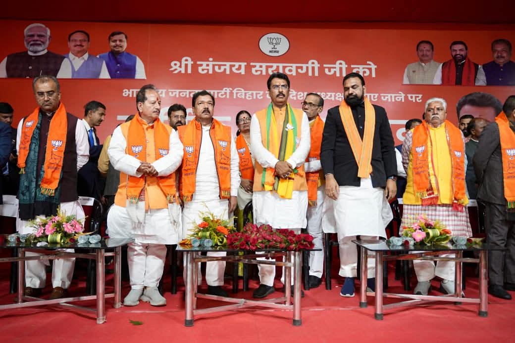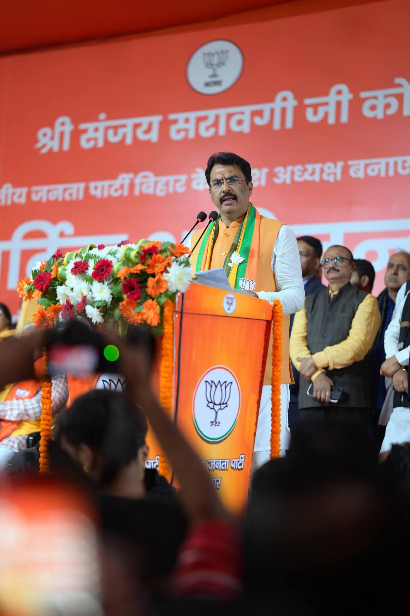 इससे पहले बिहार भारतीय जनता पार्टी (भाजपा) के नव नियुक्त अध्यक्ष संजय सरावगी पटना पहुंचे। पटना पहुंचने के बाद उनका भव्य स्वागत किया जाता। पटना उच्च न्यायालय के पास उन्होंने भीम राव अम्बेडकर की आदमकद प्रतिमा पर पुष्पांजलि कर उन्हें श्रद्धांजलि अर्पित की । इसके बाद वे एक खुले वाहन पर सवार हो गए। जुलूस की शक्ल में कार्यकर्ता उन्हे पार्टी कार्यालय लेकर पहुंचे जहां अभिनंदन समारोह का आयोजन किया गया। इस दौरान सैकड़ों मोटर साइकिल पर कार्यकर्ता आगवानी कर रहे थे जबकि इस जुलूस में हाथी और घोड़ा भी शामिल थे। इस दौरान उन्होंने जे पी की प्रतिमा पर माल्यार्पण कर नमन किया।