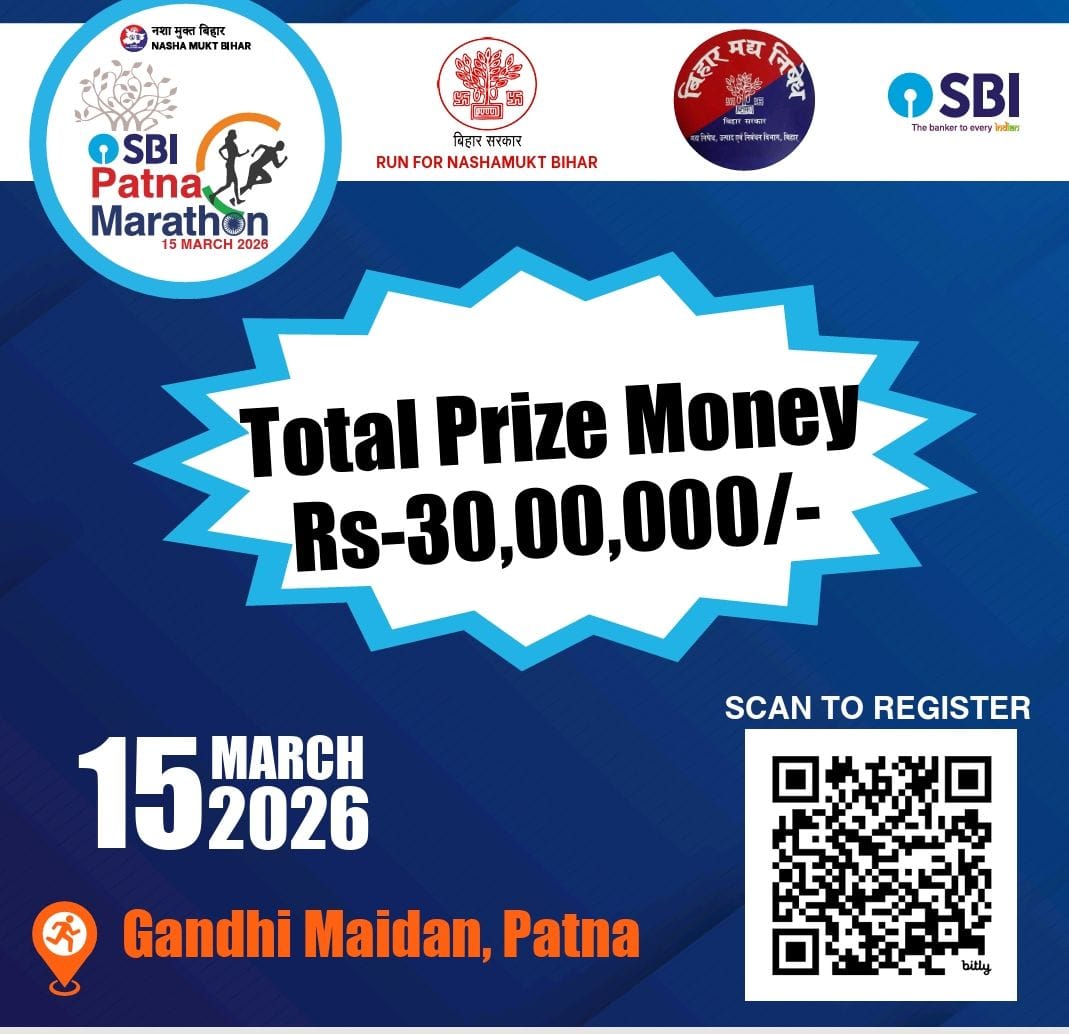 नशा मुक्त बिहार के संकल्प को जन-जन तक पहुँचाने एवं स्वस्थ जीवनशैली को बढ़ावा देने के उद्देश्य से मद्य निषेध, उत्पाद एवं निबंधन विभाग, बिहार द्वारा Patna Marathon, 2026 का आयोजन किया जा रहा है। यह मैराथन रविवार, 15 मार्च 2026 को गांधी मैदान, पटना से प्रारंभ होगी।