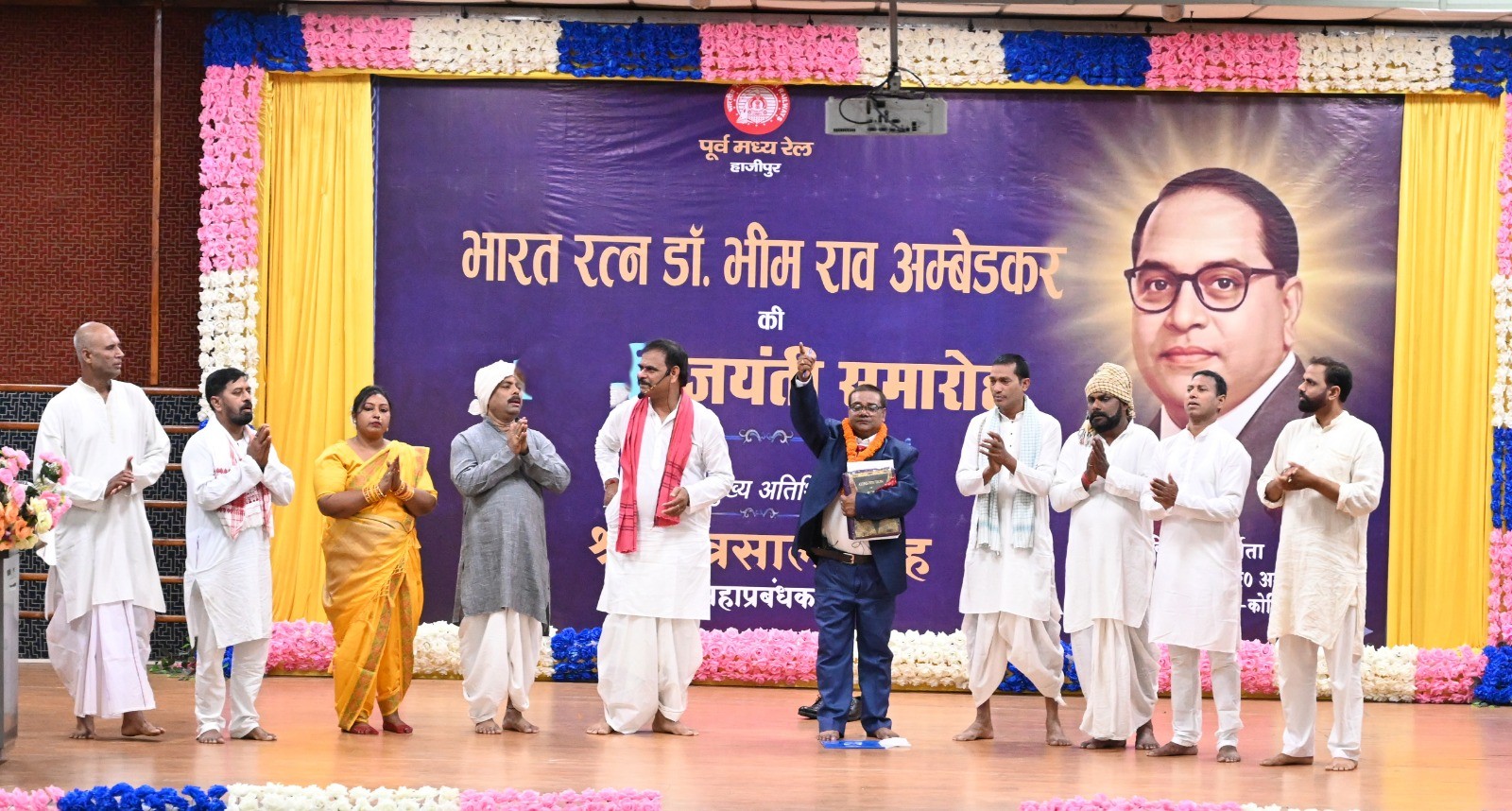 भारत रत्न बाबा साहेब डॉ. भीमराव अंबेडकर जी की जयंती के उपलक्ष्य में पूर्व मध्य रेल, मुख्यालय, हाजीपुर में आज दिनांक 16.04.2026 को वैशाली रेल प्रेक्षागृह में भव्य समारोह का आयोजन किया गया। इस अवसर पर पूर्व मध्य रेल के महाप्रबंधक श्री छत्रसाल सिंह ने बाबा साहेब के चित्र पर पुष्पांजलि अर्पित कर श्रद्धापूर्वक नमन किया। कार्यक्रम में पूमरे के प्रधान विभागाध्यक्षों व उच्चाधिकारियों सहित, यूनियन, एस.सी.एस.टी.एशोसिएशन के पदाधिकारियों द्वारा भी बाबा साहेब के चित्र पर पुष्पांजलि एवं माल्यार्पण किया गया।